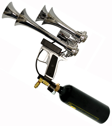 Die Hörner werden über eine CO2 Gasflasche angetrieben. Es wird kein Stromanschluss benötigt.